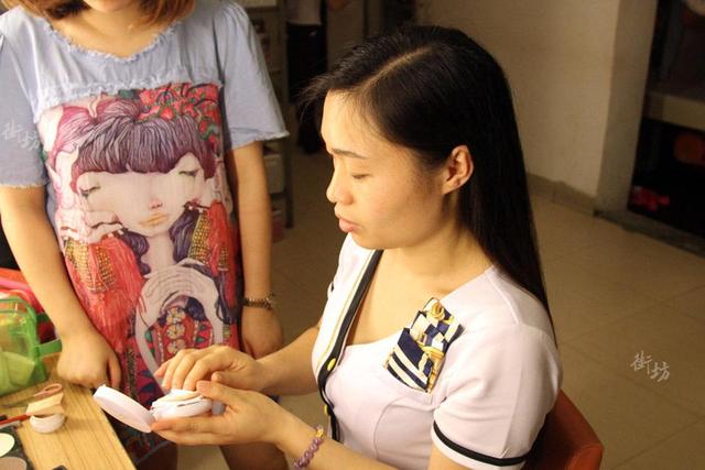 员工服装都是公司统一发的,公司还为员工专门请来了专业化妆师。每天化妆大概耗时10到20分钟左右。扑粉底、贴双眼皮假睫毛、涂腮红,吹发型这是每天必须的工作。