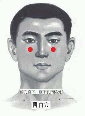 四白穴:又叫美容穴,于眼眶下方的凹陷处。按揉此穴时,手指不可移动,按揉面不要太大,顺时针、逆时针揉动8圈,反复4~8次即可。此穴具有疏经活络、养眼明目的功效,按摩此穴可以缓解眼部疲劳、眼花、黑眼圈等症状。