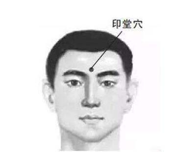 印堂穴:位于两眉连线的中点。按摩此穴可以起到醒脑开窍、疏风止痛、通经活络的功效。按摩时将中指放在印堂穴上,用较强的力点按10次,再顺时针、逆时针揉动20~30圈即可。