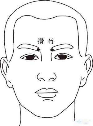 攒竹穴:位于眉毛内侧边缘凹陷处。按摩此穴可迅速缓解眼睑跳动、目视不明、目赤肿痛、迎风流泪等症状。按摩时以拇指按压此穴,并顺时针、逆时针揉动20~30圈即可。